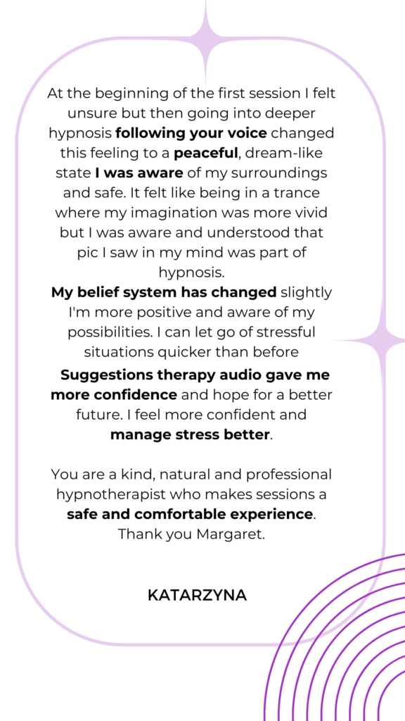 Take the first step towards a healthier, happier you. Book your Free 20-minute Discovery Call today. On this call, I will answer all your questions, and we will decide what is best for you to book from my sessions: 1:1 or group session and start your journey to personal transformation. Whether you’re new to hypnotherapy or have tried it before, I am here to support you every step of the way.