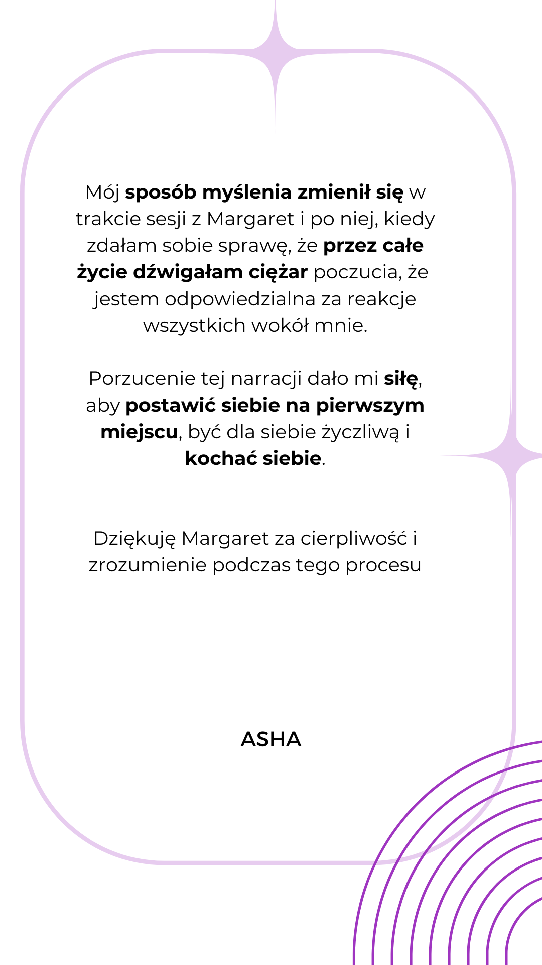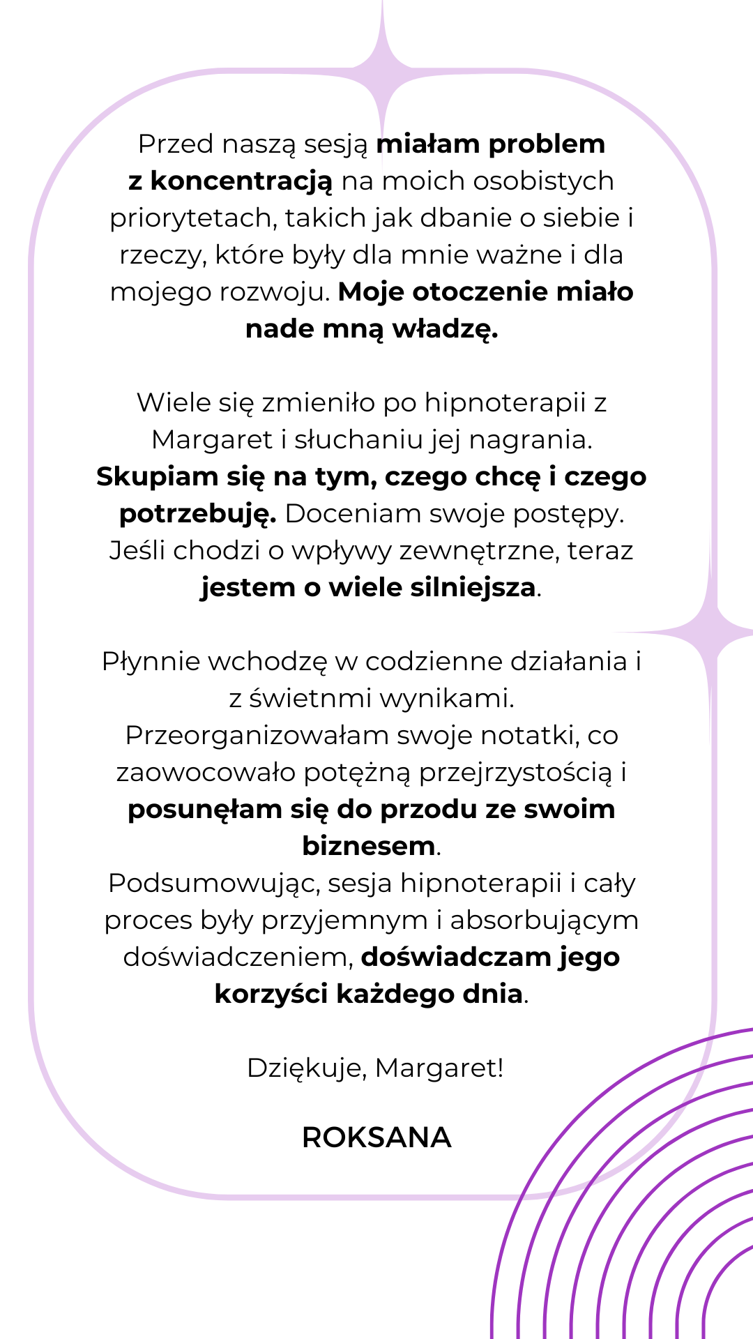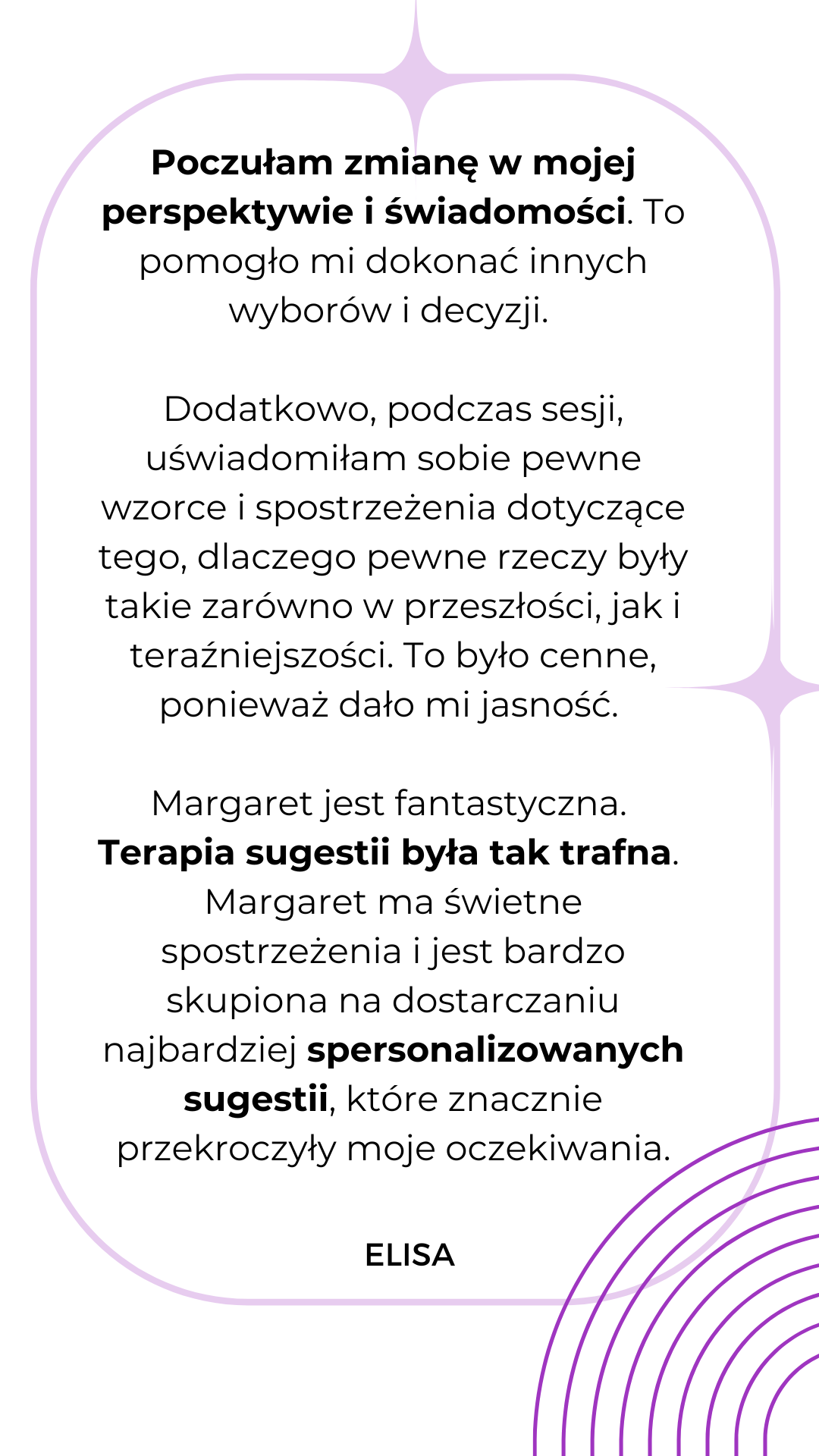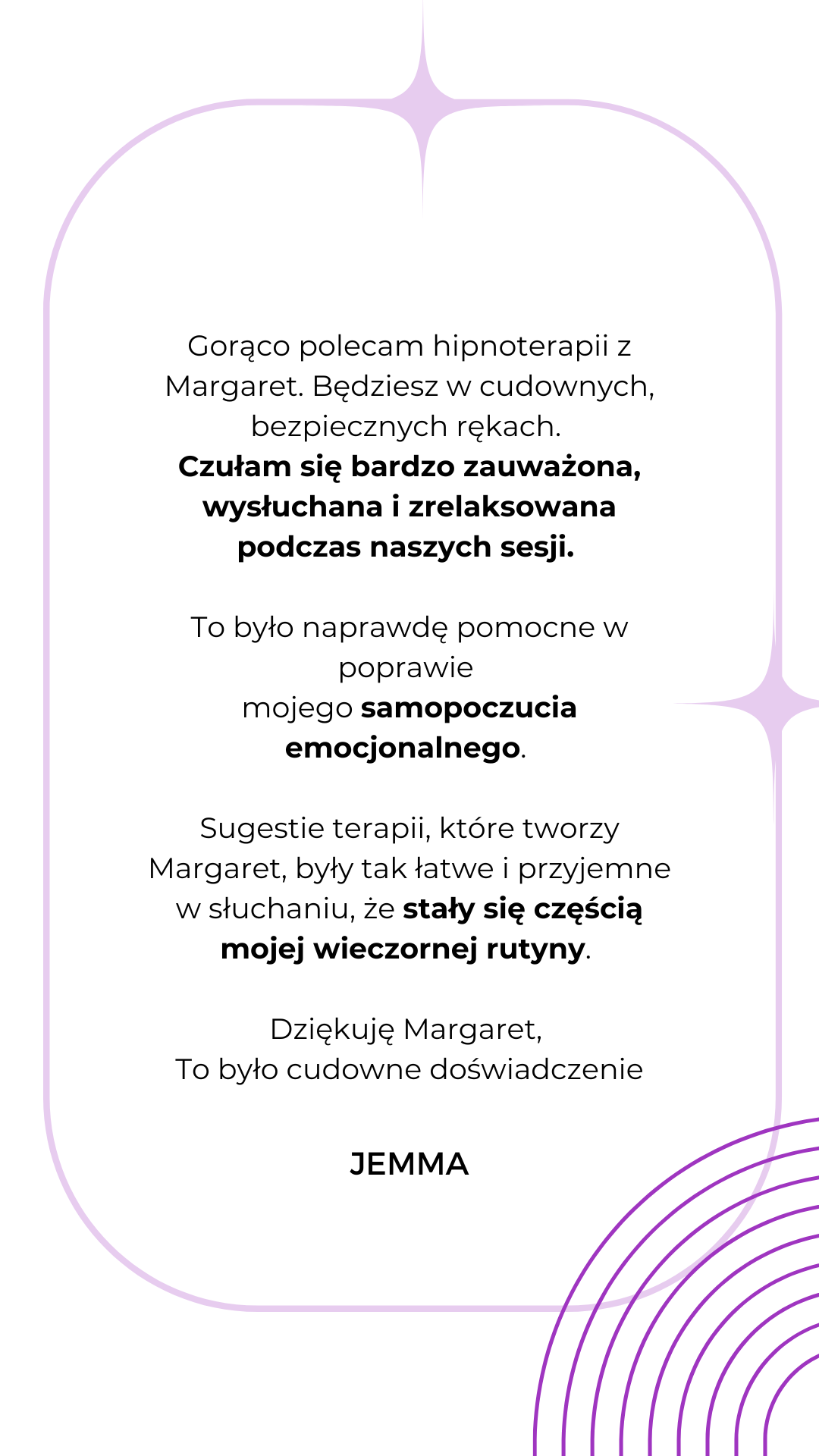 Mam na imię Margaret, jestem certyfikowanym hipnoterapeutą, life coachem specjalizująca się w coachingu indywidualnym w rozwoju samo - przywództwa, emocjonalnej inteligencji, personalnym rozwoju.
